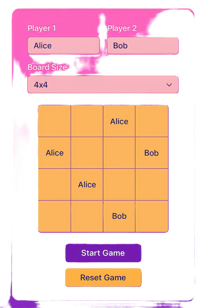 This version isn’t limited to a boring 3×3 grid. You can let users pick their board size (3×3, 4×4, 5×5, or even bigger). On top of that, we’ll add a personal touch — player names. Instead of just “X” and “O,” you’ll see Alice vs Bob!
