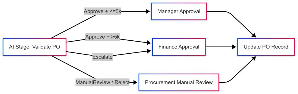 AI.decision == "Approve"andPOAmount <= 5000โ Manager Approval (single approver).